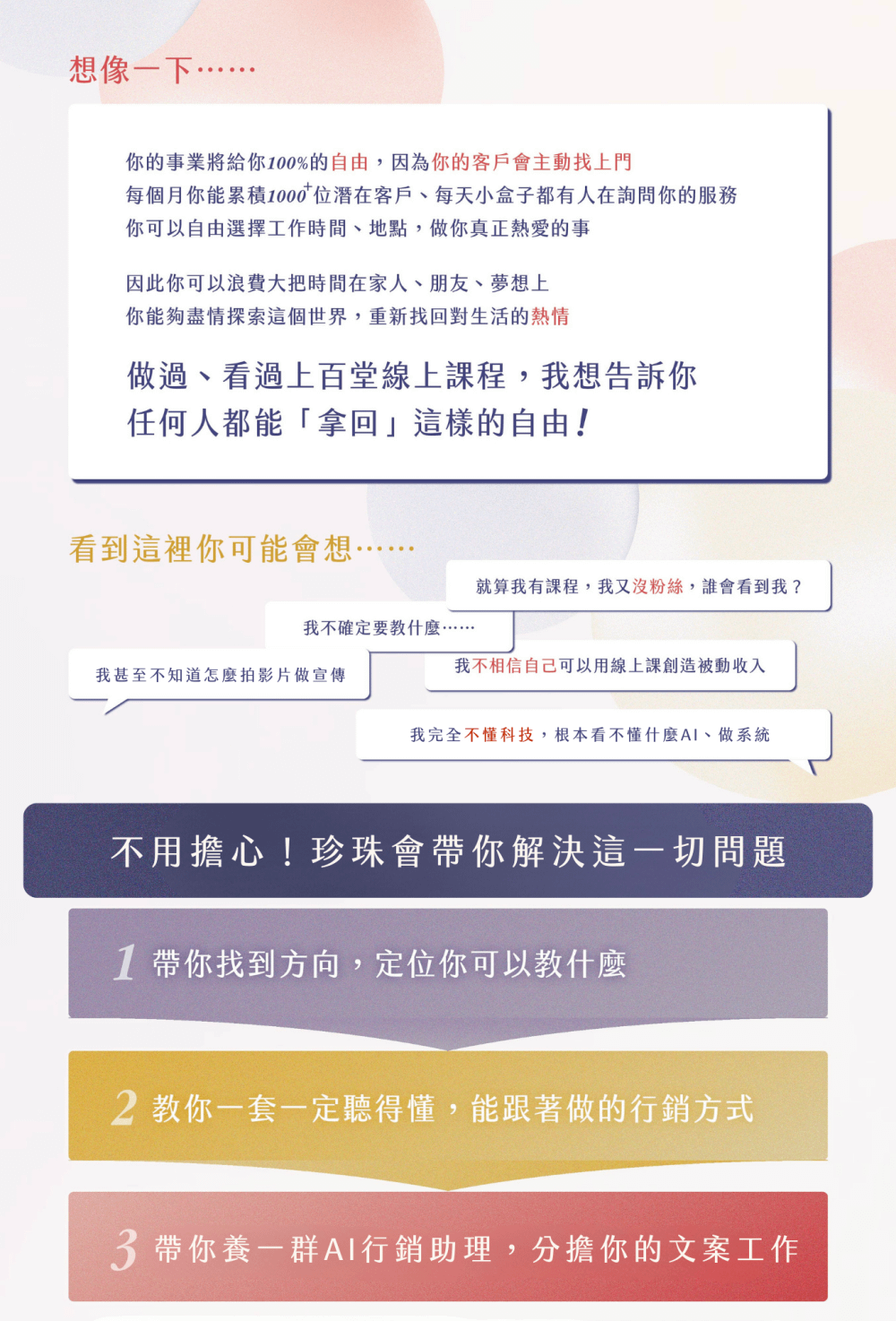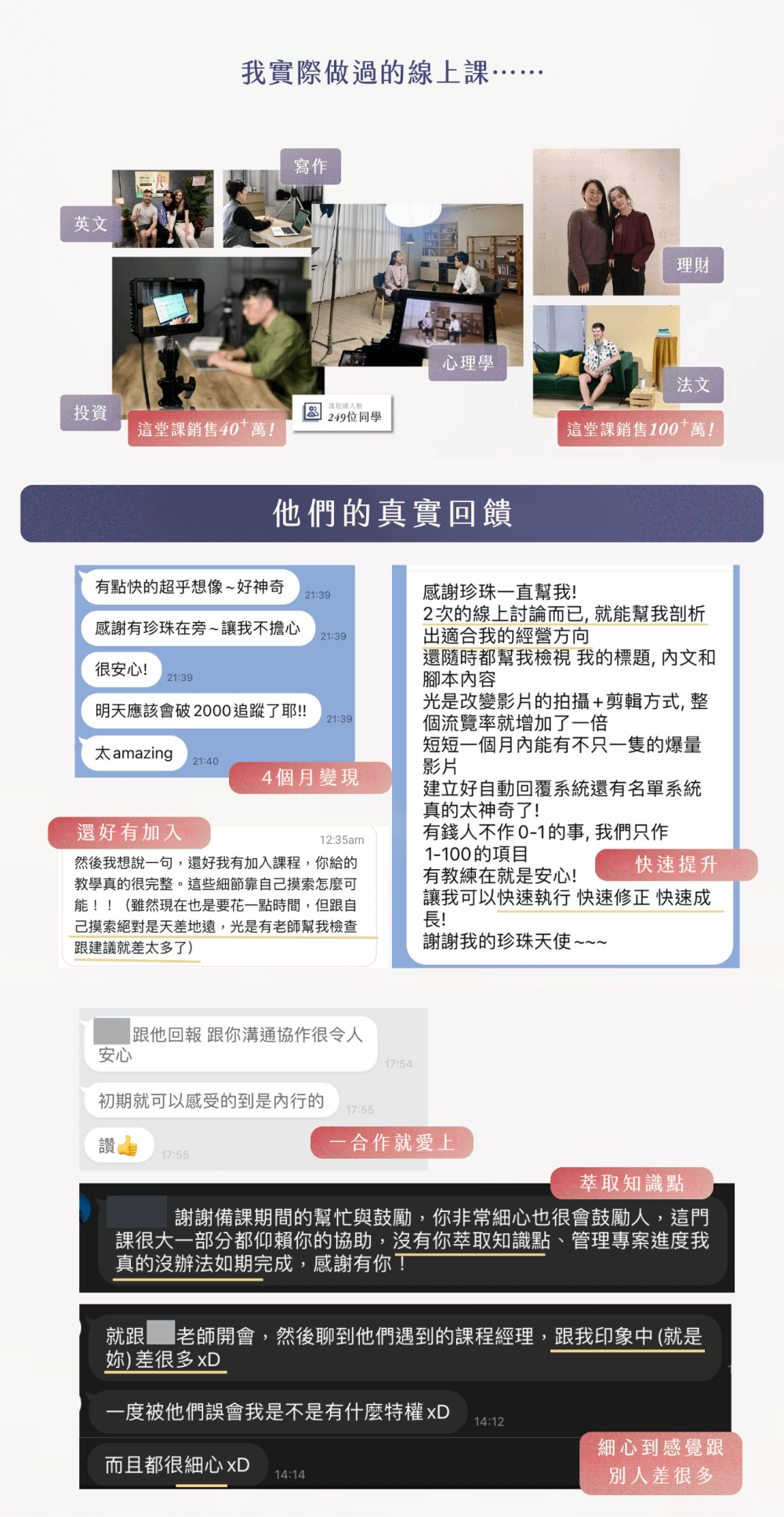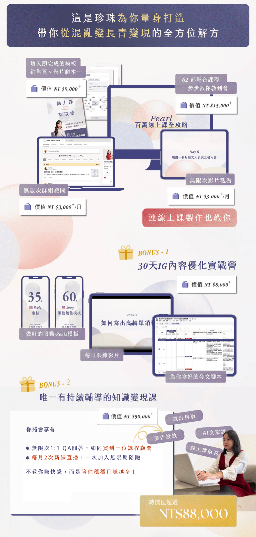 我們的任何網站中提及的數據與案例,均為基於歷史表現的估算參考,我們任何網站中提到的銷售數字/成績,也均為我的個人銷售數字/成績,並不意指你可以複製這些成果,所有數字僅為說明用途。你的成果將因多項因素而有所差異,包含但不限於:個人背景、既有經驗、執行力與工作態度等。任何事業的發展都伴隨風險,需要投入大量且持續的努力與行動。若您無法接受這個前提,請勿報名課程或購買相關產品。如有任何問題,請來信gift@giftofpearl.com,我們將盡速提供你協助。